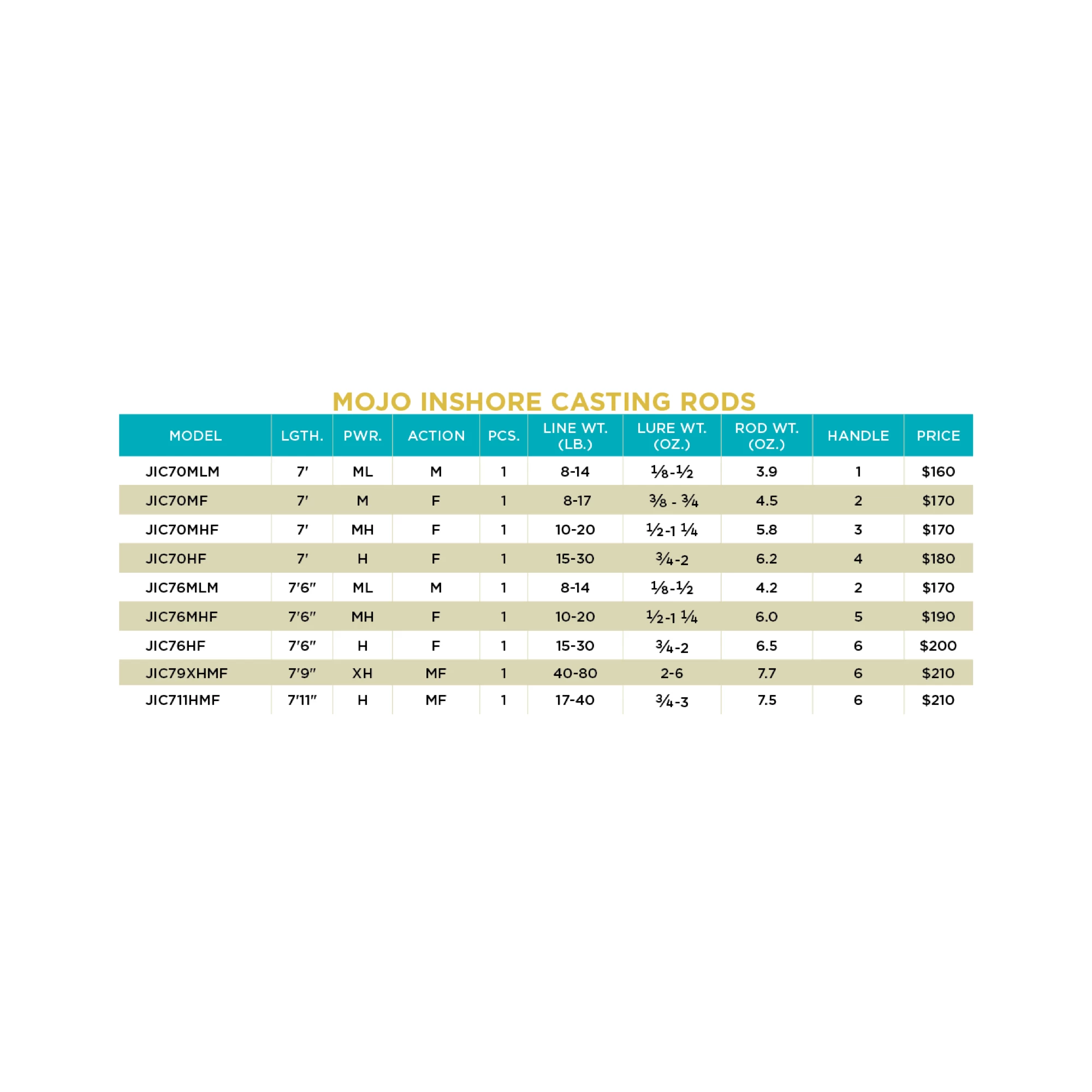 | Length | JIC70MLM / 7’, JIC70MF / 7’, JIC70MHF / 7’, JIC70HF / 7’, JIC76MLM / 7’6”, JIC76MHF / 7’6”, JIC76HF / 7’6”, JIC79XHMF / 7’9", JIC711HMF / 7’11" |