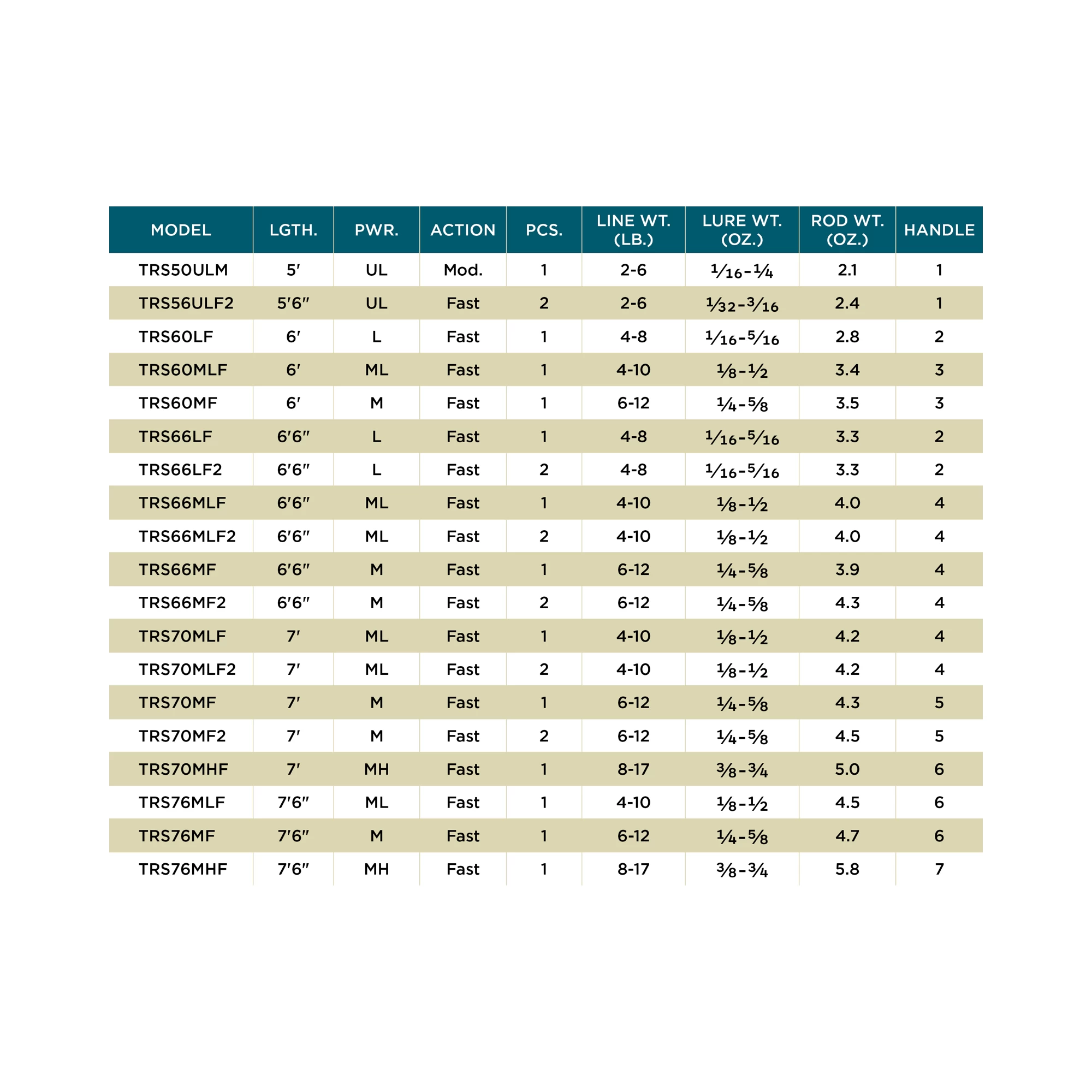 | Length | TSR50ULM / 5’, TSR56ULF2 / 5’6”, TSR60LF / 6’, TSR60MF / 6’, TSR60MLF / 6’, TSR66LF / 6’6", TSR66LF2 / 6’6", TSR66MF / 6’6", TSR66MF2 / 6’6”, TSR66MLF / 6’6”, TSR66MLF2 / 6’6”, TSR70MF / 7’, TSR70MF2 / 7’, TSR70MHF / 7’, TSR70MLF / 7’, TSR70MLF2 / 7’, TSR76MLF / 7’6”, TSR76MF / 7’6”, TSR76MHF / 7’6” |